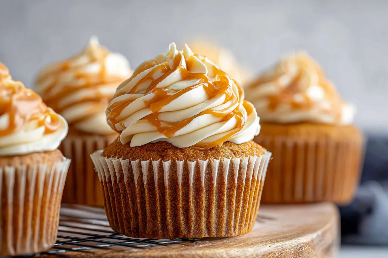 - Frost the Cupcakes: Once the cupcakes are completely cool, pipe or spread the frosting generously on top of each cupcake. Drizzle with additional caramel sauce if desired.